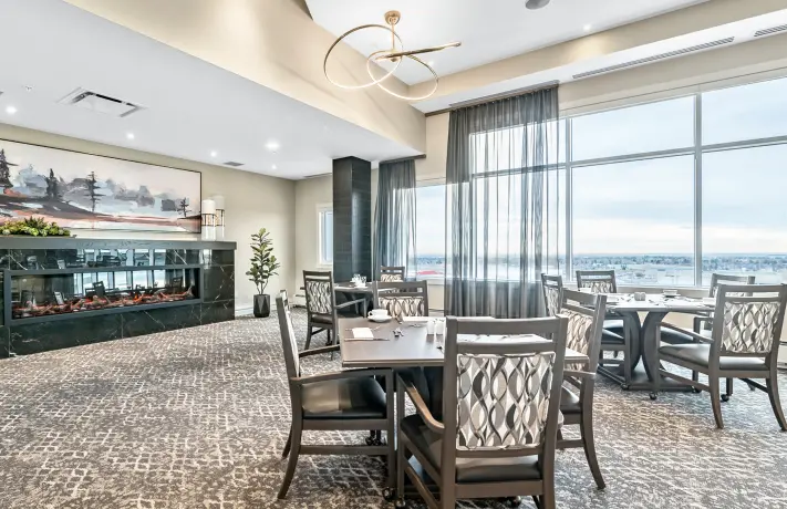 Experience the pleasure of refined dining in our elegant dining room, which boasts stunning mountain views. This sleek space offers a delectable à la carte menu, accompanied by an exquisite dining area, providing an ideal setting for special occasions or simply enjoying a sophisticated meal with family and friends within your independent living community.